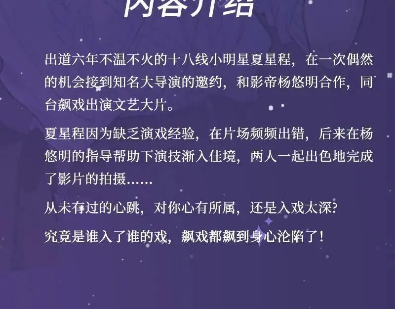 夏星程,一个演技一般人气普通的小鲜肉,在娱乐圈混了六年,还依然只是个十八线的小明星,本以为一直会这样糊穿地心。可那天,知名导演找上他、和影帝一起飙戏、出演文艺大片,众多机会悉数砸来。可还没来得及高兴…这飙着飙着,画风就开始有点不太对劲…究竟是身心沦陷,还是入戏太深?