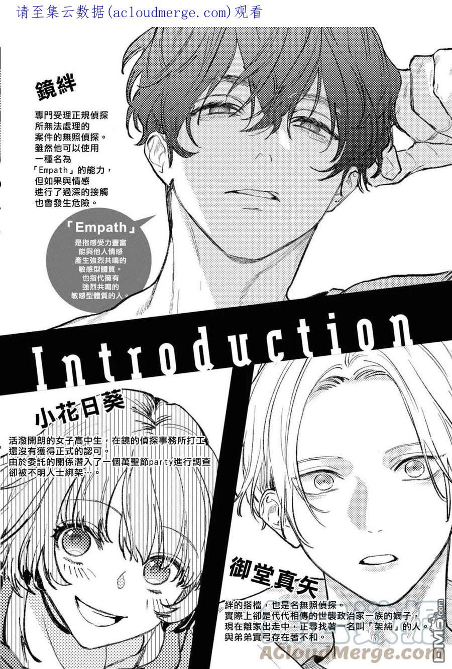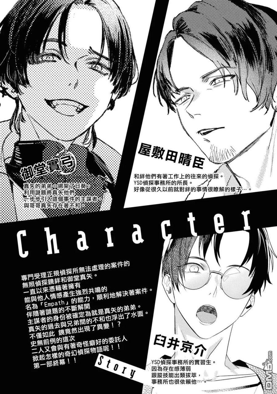专门受理正规侦探所无法处理案件的无照侦探镜绊,以及他的搭档御堂真矢。镜有着可以感知到他人情感的谜一样的能力「Empathy」。史无前例的二人将会与有着特殊癖好的委托人们展开怎样的一段精彩故事,敬请期待——!