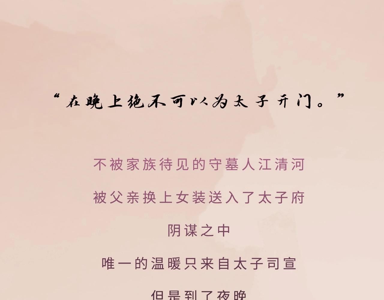 “在晚上绝不可以为太子开门。”不被家族待见的守墓人江清河,被父亲换上女装送入了太子府。阴谋之中,唯一的温暖只来自太子司宣,但是到了夜晚,那份温暖就变异成了甜蜜的高烧,让司宣如同寻食野兽一般徘徊他门前…