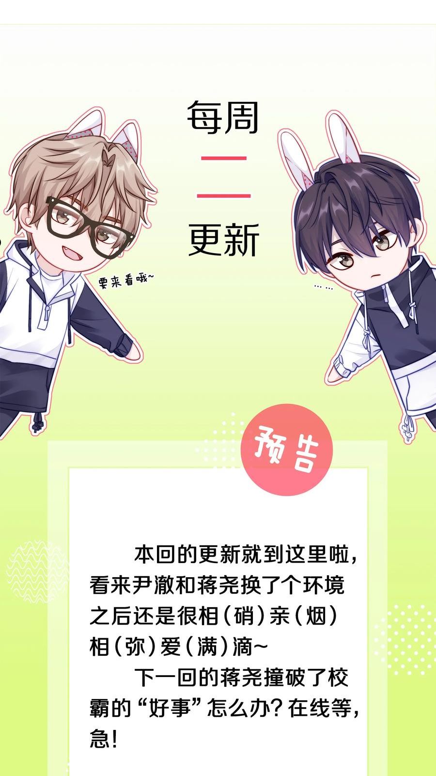 简介某市有这么两位校霸:一位:不社交不早恋,沉迷学习日渐孤僻另一位:我的对象必须身娇体软乖巧听话某天,这两位校霸相遇了。蒋尧:兔崽子别不识好歹。蒋尧:兔崽子还挺可爱。蒋尧:兔崽子……尹澈:滚。阳光大灰狼vs孤僻小兔子蒋尧X尹澈
