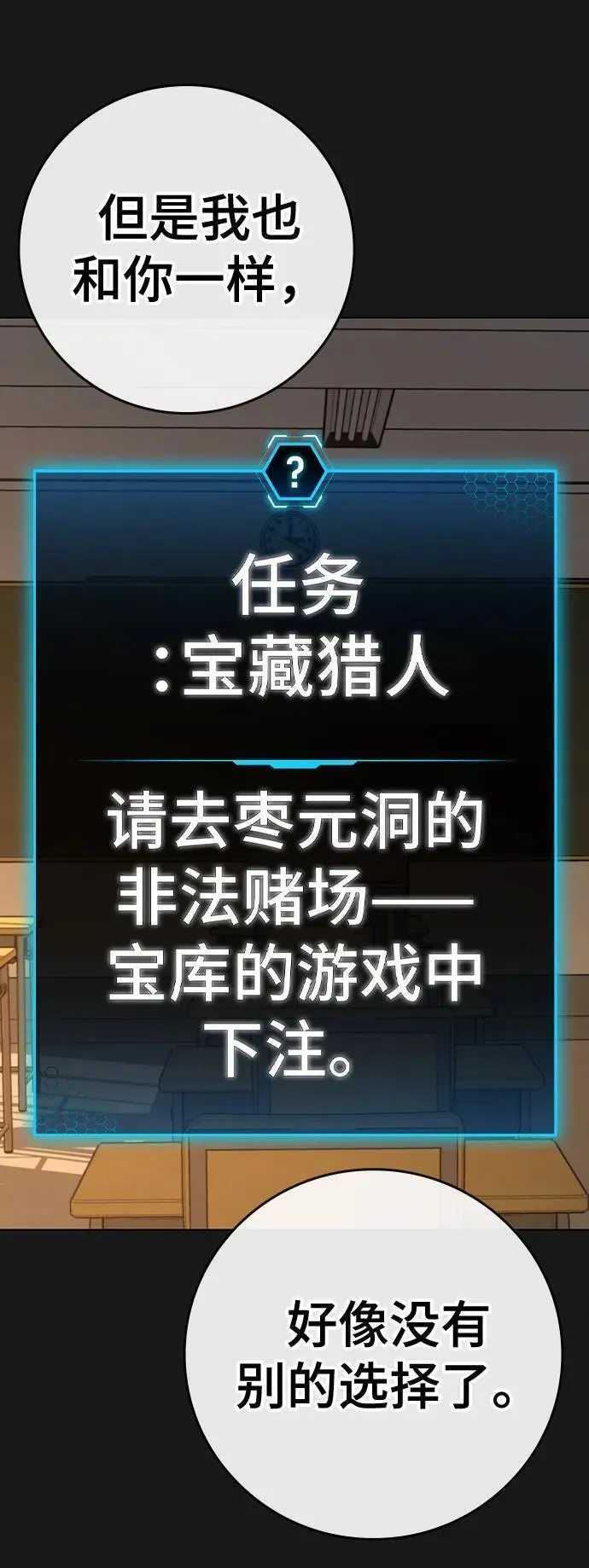 现实任务又名现实闯关,类型为冒险的高人气漫画,漫画简介:小混混的威胁下为了得到游戏里的装备,整整一周熬夜玩游戏不幸死亡的夏道完,睁眼回到一周之前的教室重新复活... 一切都和那天一样。唯一改变的就是眼前浮现出现【任务提示】!什么?让我利用我迄今为止玩过的游...