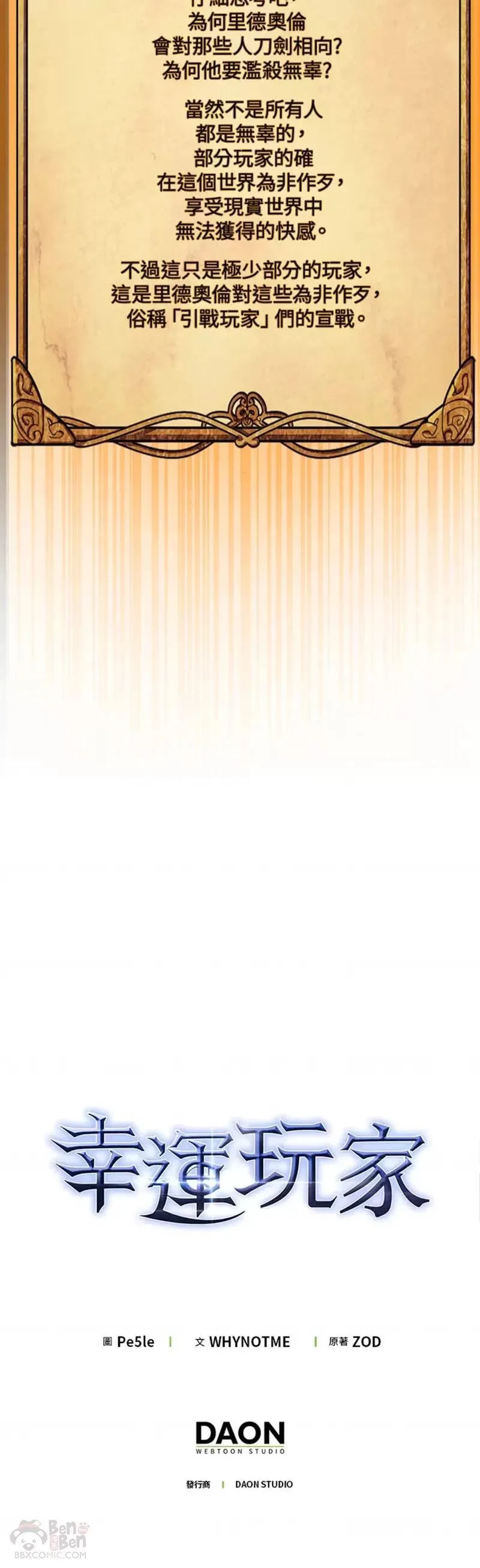 幸运玩家又名,类型为动作|热血|游戏的高人气漫画,漫画简介:衰运连连的他,却在即将放弃游戏的那一刻出运了!史上第一款虚拟实境游戏《CIRCUIT》,想靠这款游戏咸鱼翻身的李基浩在一夕之间得到了4亿玩家梦寐以求的超稀有道具!「这就是鲁蛇的绝地大翻身!」