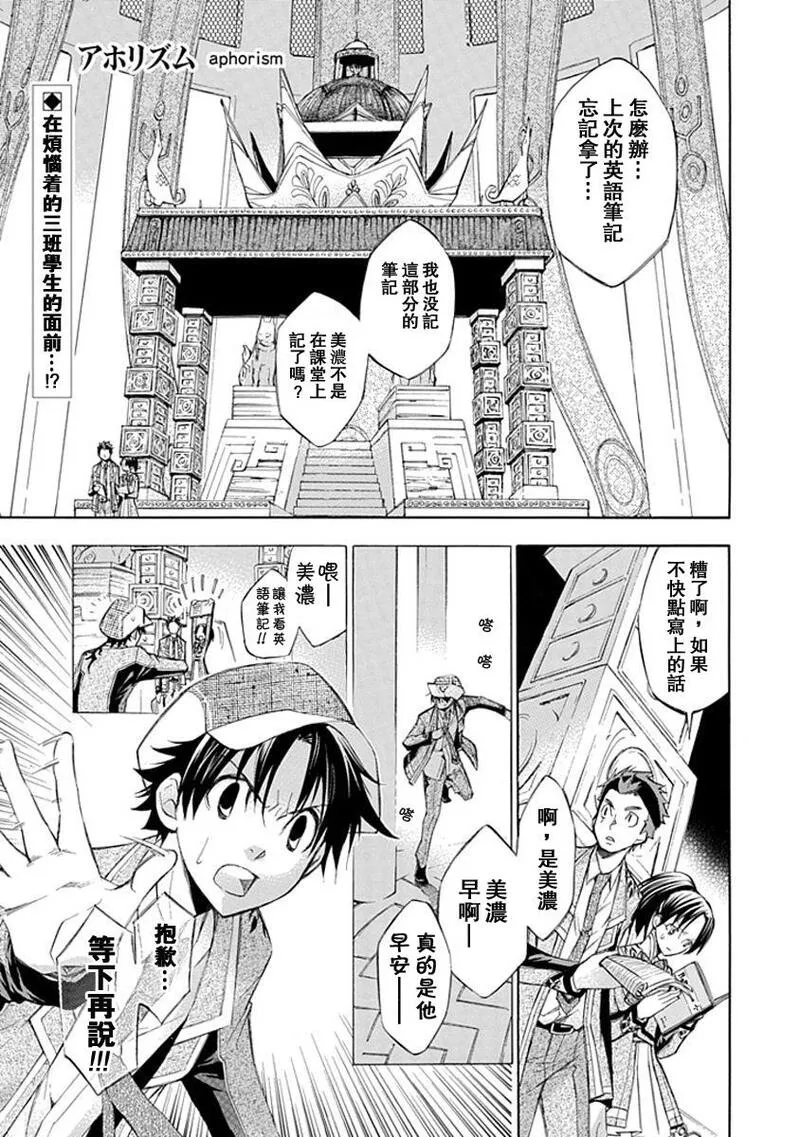 格言又名杀戮箴言aphorism aphorism/格言 格言aphorism,类型为热血机战|魔法奇幻的高人气漫画,漫画简介:又名:杀戮箴言aphorism aphorism/格言 格言aphorism 唯有能看见空中岛屿的学生才能入学, 全员住宿制的男女合校「楢鹿高级中学」。 只要能顺利毕业,前途将一片光明。 然而,怀抱梦想与希望的学生们将面对的 却是「神蚀」! 这是个现实被一点一滴残酷吞蚀的绝望考验… 只有挺身迎战、绝不妥协之人才能存活的神之试练!