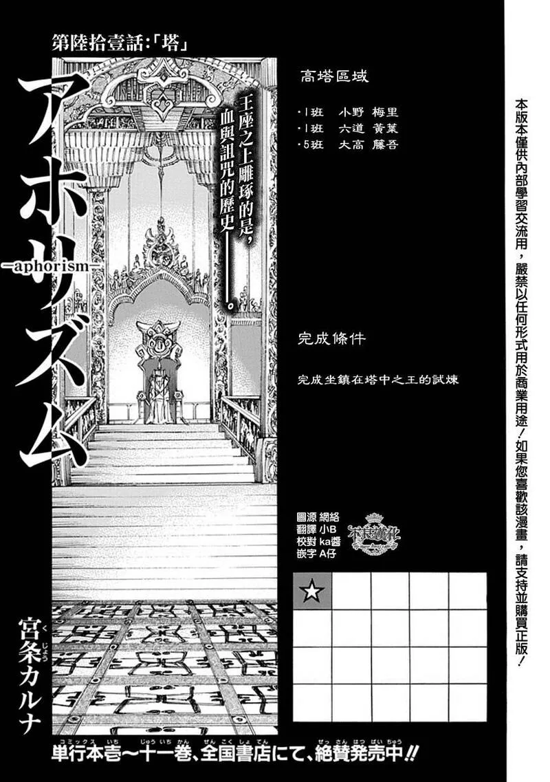 格言又名杀戮箴言aphorism aphorism/格言 格言aphorism,类型为热血机战|魔法奇幻的高人气漫画,漫画简介:又名:杀戮箴言aphorism aphorism/格言 格言aphorism 唯有能看见空中岛屿的学生才能入学, 全员住宿制的男女合校「楢鹿高级中学」。 只要能顺利毕业,前途将一片光明。 然而,怀抱梦想与希望的学生们将面对的 却是「神蚀」! 这是个现实被一点一滴残酷吞蚀的绝望考验… 只有挺身迎战、绝不妥协之人才能存活的神之试练!