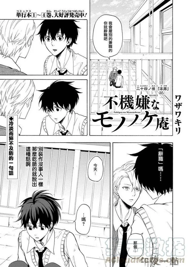 不愉快的妖怪庵又名忧郁的物怪庵不机嫌なもののけ庵,类型为神鬼|校园的高人气漫画,漫画简介:芦屋因为被妖怪附身,因此进入高中就读后,已经整整七天都是在学校保健室渡过。为了设法解决问题,芦屋向两坪大的茶室「妖怪庵」之主求助--于是,解救在种种缘由下误入现世的妖怪们并带其回隐世,不愉快的妖怪庵奇...