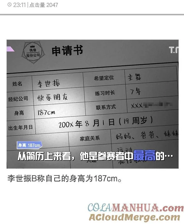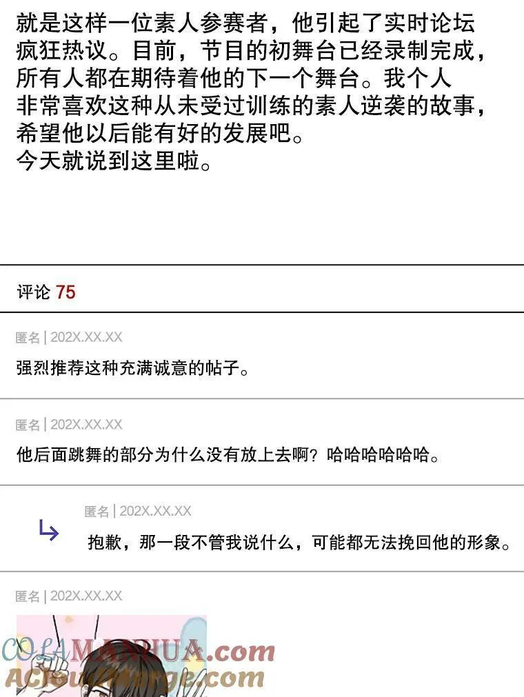 不出道就完蛋了又名患上不出道就会死的病,类型为奇幻|娱乐圈的高人气漫画,漫画简介:宿醉醒来,29岁的柳建佑发现自己身在一个陌生的旅馆。而且“今天”还是3年前的12月?!更离谱的是,他的眼前出现了“状态栏”。状态栏提示:“一年之内不出道就会死”。为了出道,他参加了一档偶像选秀节目——...