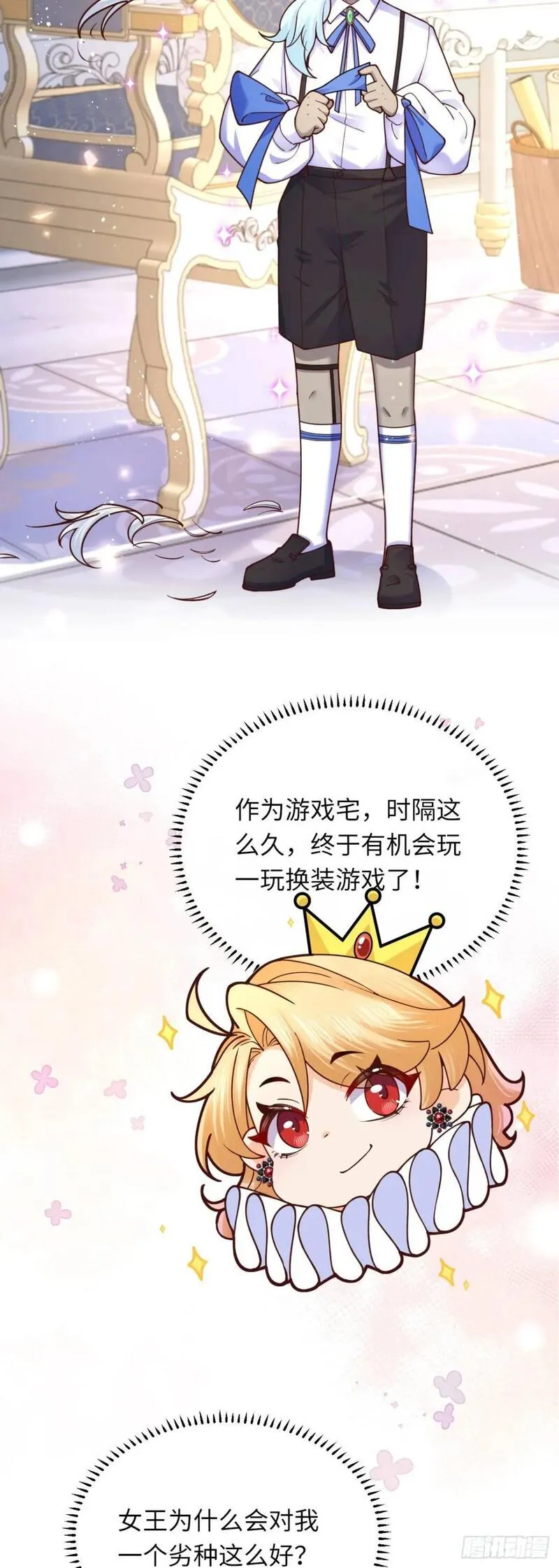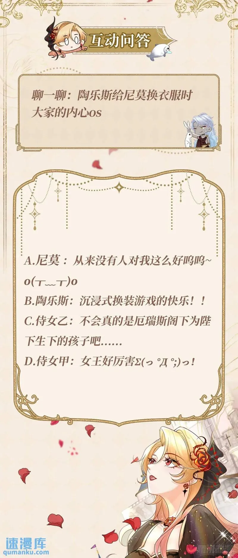 当咸鱼成为风情女王又名,类型为穿越的高人气漫画,漫画简介:996猝死的陶乐斯发誓下辈子当一条咸鱼。眼睛一睁一闭,穿越到18X乙女游戏里,成为臭名昭著的风情女王,玩过游戏的陶乐斯知道,女海王的下场十分凄惨,为了保命,陶乐斯记下两大攻略要点:一、男宠是疯批,得罪...