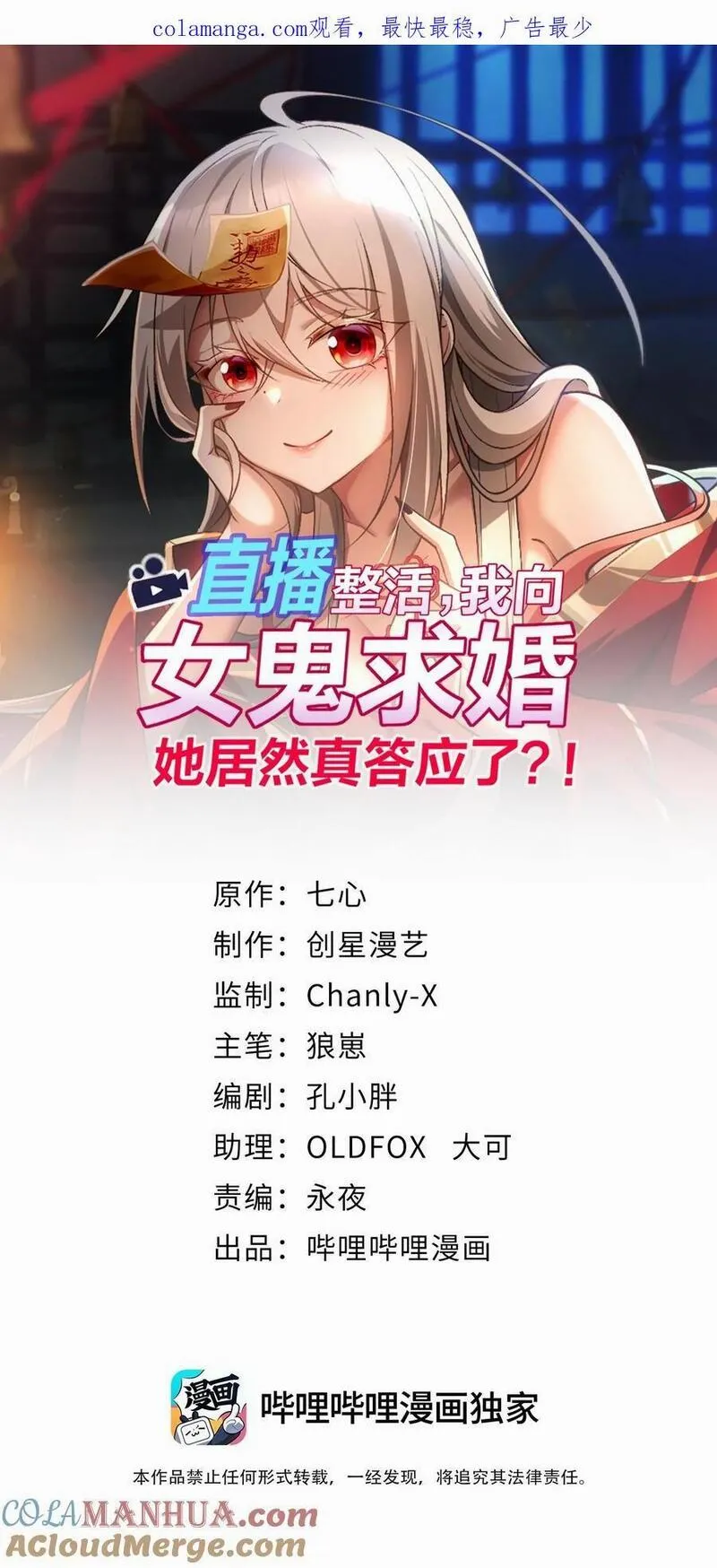 直播整活,我向女鬼求婚——她居然真答应了?!又名,类型为的高人气漫画,漫画简介:简介为了节目效果,方宁请来便宜剧组,准备在公主坟直播过夜,却没想到直播中途出了事——方宁误把女鬼当剧组女演员,直接求婚了!现在对方当真了怎么办?!在线等,急急急!