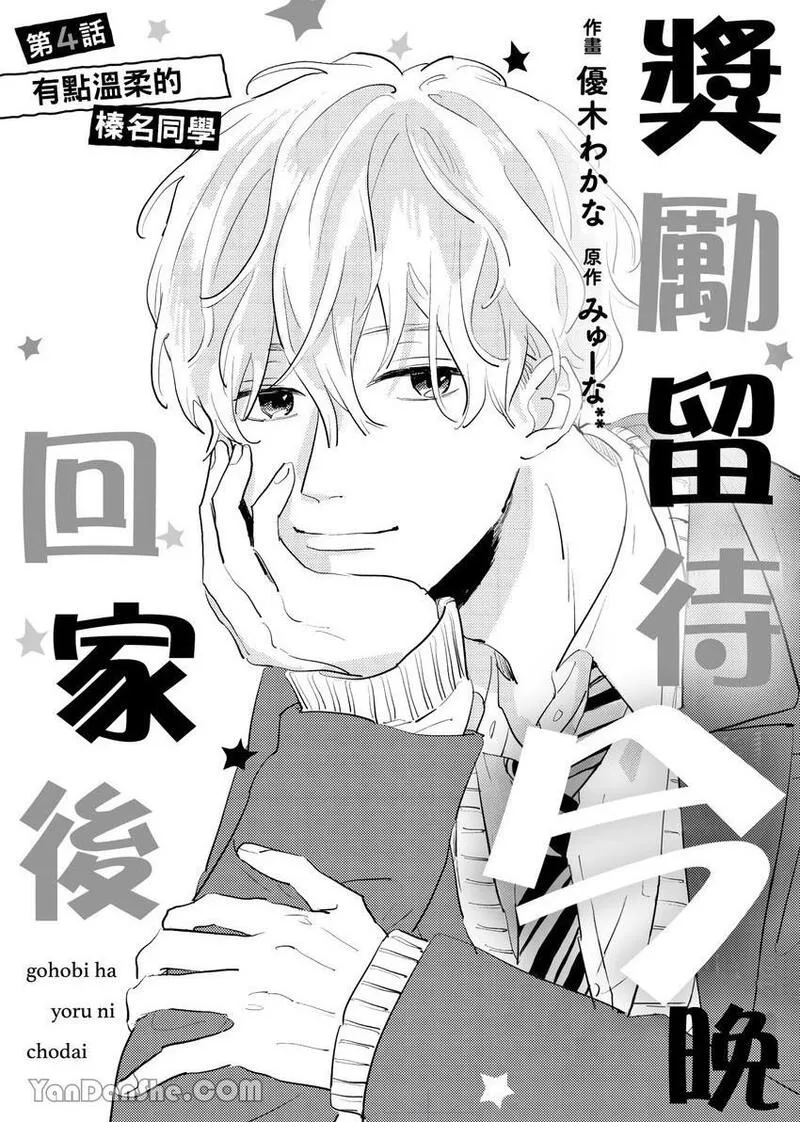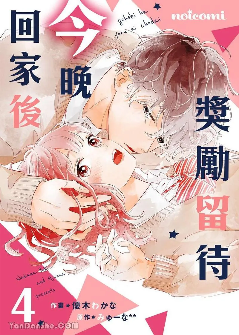 奖励留待今晚回家后又名ごほうびは夜にちょうだい,类型为优木わかな|同居|校园|溺爱|女性向的高人气漫画,漫画简介:「如何?很甜吧——」图书委员雏乃某天值日时,发现超受欢迎的榛名同学正睡在图书室。叫醒榛名同学后,雏乃非但被缠上,甚至连初吻都遭到夺走…!雏乃想当作什么都没发生过,但不知为何,当天榛名同学竟出现在她家中,雏乃的母亲还突然宣布两人将同住半年!?自由奔放的榛名同学不断甜蜜逼近、令人心跳加速的同居恋情♡