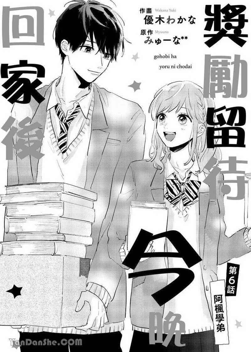 奖励留待今晚回家后又名ごほうびは夜にちょうだい,类型为优木わかな|同居|校园|溺爱|女性向的高人气漫画,漫画简介:「如何?很甜吧——」图书委员雏乃某天值日时,发现超受欢迎的榛名同学正睡在图书室。叫醒榛名同学后,雏乃非但被缠上,甚至连初吻都遭到夺走…!雏乃想当作什么都没发生过,但不知为何,当天榛名同学竟出现在她家中,雏乃的母亲还突然宣布两人将同住半年!?自由奔放的榛名同学不断甜蜜逼近、令人心跳加速的同居恋情♡
