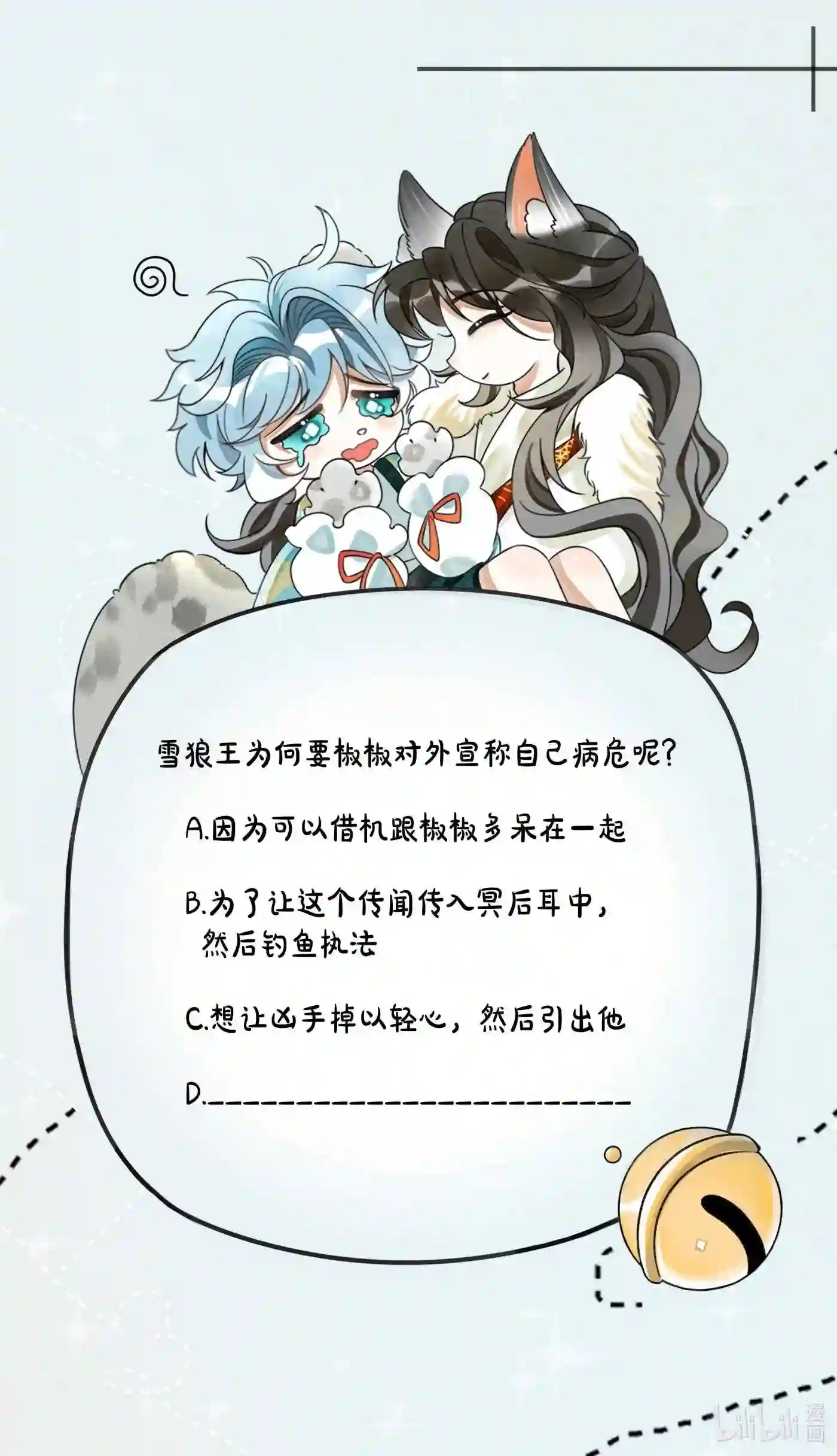 CP:白切黑雪狼王X傻白甜雪豹雪豹美人一紧张就是喜欢咬尾巴,当他被送到雪狼王的寝室时,他也是瑟瑟发抖地咬着尾巴的雪狼王:你怕什么?我又不会吃了你。雪豹:我怕你XX我的OO。雪狼王:那真是失礼了,本王正是为此而来的。——雪豹:听说只有雪狼才可以当王后……?雪狼王:有这个规定吗?我去问问生物学家——三天之后,北国的生物学家表示:雪豹是雪狼的一种———架空背景的跨物种妖怪的爱情故事。